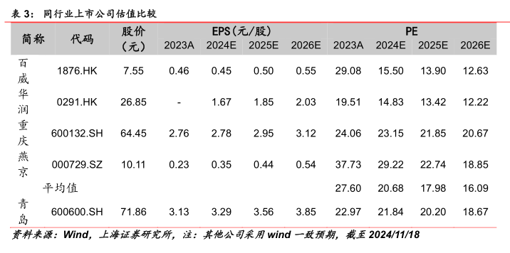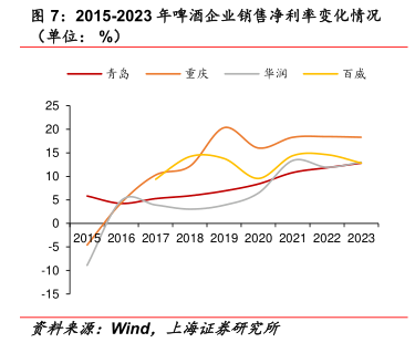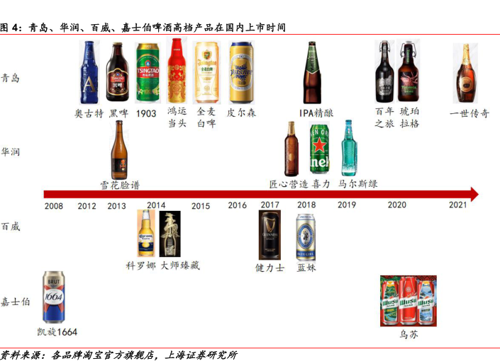 图表内容 图4:青岛、华润、百威、嘉士伯啤酒高档产品在国内上市时间 青岛 奥古特黑啤1903 鸿运全麦 皮尔森 IPA精酿 百年琥珀 一世传奇 当头白啤 之旅拉格 华润 匠心营造喜力马尔斯绿 百威 科罗娜大师臻藏 健力士 蓝妹 嘉士伯 凯旋1664
