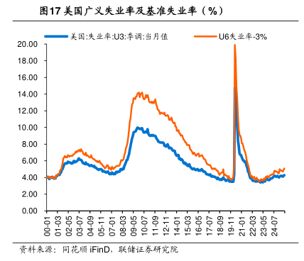 图表内容 图17美国广义失业率及基准失业率(%) 美国:失业率U3:季调:当月值 U6失业率-3% 20.00 18.00 16.00 14.00 12.00 10.00 8.00 6.00 4.00 2.00 0.00 资料来源:同花顺FinD 联储证券研究院