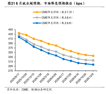图表内容 图218月就业超预期,市场降息预期推后(bps) ◆一CME降息预期(载至7.31) 一CME降息预期(至8.4) ◆一CME降息预期(裁至9.8》 2025/10/29 20259/17 20263/18 2026/128 2025/1210 20264/29 20266/17 20269/16 2026/729 2026/10f28 2026/129 资料来源: CME 联储证券研究院