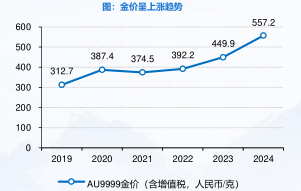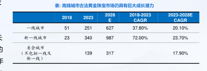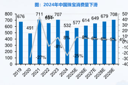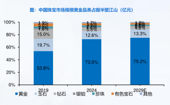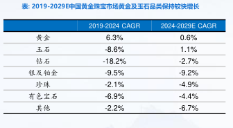 • 黄金品类兼具消费与投资二重属性,市场份额占据半壁江山。作为中国珠宝市场消费的主力,2024年黄金品类市场规模占据中国珠宝市场73%的最大份额。黄金产品凭借其历久不衰的文化意义,兼具消费投资二重属性,2019-2024年复合年增长为6.3%;随着消费升级及年轻化消费群体的兴起,预计2024-2029年仍将以0.6%的复合增速保持快速增长。
